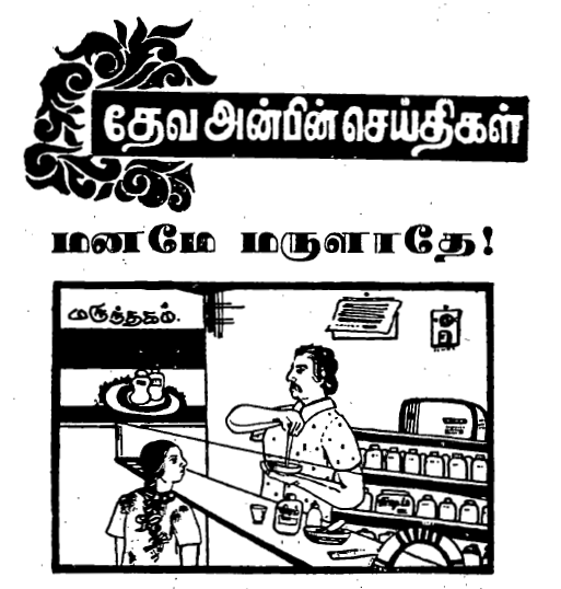 சுந்தரால் என்ன செய்யமுடியும்? அச்சிறுமியையோ அல்லது அவள் வசிக்கும் இடத்தையோ அவன் அறியான். அச்சிறுமியை மட்டும் இப்போது அவன் கண்டு கொண்டானானால்! தன் மருந்தகத்தை விட்டு இருள் நிறைந்த வீதிக்கு ஓடினான்! தன்னால் முடிந்தமட்டும் வலதுபுறமும் பின் இடது புறமும் ஓடினான்!! தேடினான்!!! மூடிவோ பலனற்றுப் போயிற்று. அநேக வீதிகளின் ஊடாகக்கடந்த அச்சிறுமியையோ கரும் இருள் கவ்விக்கொண்டது. அச்சிறுமியோ வேறு அதிகப் பரபரப்புடன் காணப்பட்டாள். ஒருவேளை, தன் வீட்டையடைந்த சிறுமி அதே நிமிடத்தில் அவ்விஷத்தை ஊற்றித் தன் தாய்க்குக் கொடுத்திருந்தால்? ஆறியா சுந்தருக்குக் குப்பென்று வியர்த்துக்கொட்டியது! அவனுக்கு என்ன செய்வதென்றே புரியவில்லை. அப்பொழுது …… தன் கிறிஸ்தவ நண்பன் மறக்க வேண்டாமெனச் சொன்ன திருமறையின் தேவவாக்கு திடீரென அவன் ஞாபகத்திற்கு வந்தது.