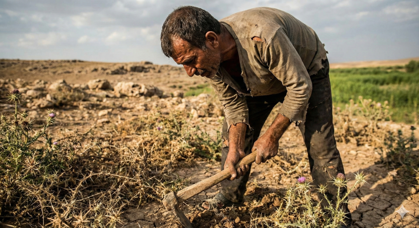 இரண்டாவதாக, அவனது வேலை ஒரு பெரிய பாரமாக மாறுகிறது. அவன் முன்பு தோட்டத்தை சிரமமின்றி பராமரித்து வந்ததற்கு மாறாக, இப்போது தன் முகத்தின் வியர்வை சிந்த உழைக்க வேண்டும். இந்தத் துன்பத்தின் மத்தியிலும், அவன் பட்டினியால் சாகமாட்டான் என்பது ஒரு கருணையாகக் கருதப்படுகிறது.
