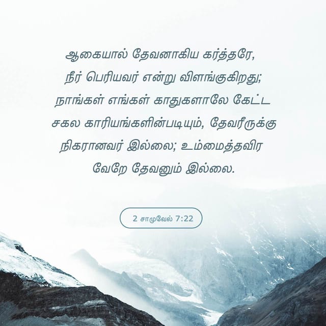ஆகையால் தேவனாகிய கர்த்தரே, நீர் பெரியவர் என்று விளங்குகிறது; நாங்கள் எங்கள் காதுகளாலே கேட்ட சகல காரியங்களின்படியும், தேவரீருக்கு நிகரானவர் இல்லை; உம்மைத் தவிர வேறு தேவனும் இல்லை.