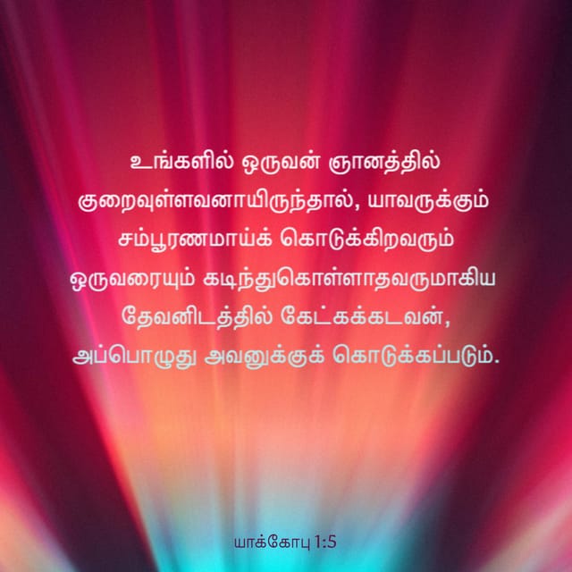உங்களில் ஒருவன் ஞானத்தில் குறைவுள்ளவனாயிருந்தால், யாவருக்கும் சம்பூரணமாய்க் கொடுக்கிறவரும் ஒருவரையும் கடிந்துகொள்ளாதவருமாகிய தேவனிடத்தில் கேட்கக்கடவன், அப்பொழுது அவனுக்குக் கொடுக்கப்படும்.
