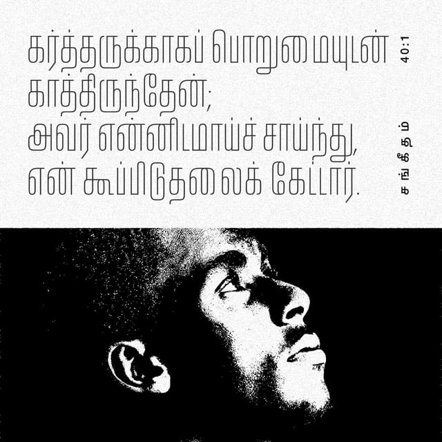 கர்த்தருக்காகப் பொறுமையுடன் காத்திருந்தேன்@ அவர் என்னிடமாய்ச் சாய்ந்து, என் கூப்பிடுதலைக் கேட்டார். பயங்கரமான குழியிலும் உளையான சேற்றிலுமிருந்து என்னைத் தூக்கியெடுத்து, என் கால்களைக் கன்மலையின்மேல் நிறுத்தி, என் அடிகளை உறுதிப்படுத்தி, நமது தேவனைத் துதிக்கும் புதுப்பாட்டை அவர் என் வாயிலே கொடுத்தார், அநேகர் அதைக் கண்டு, பயந்து, கர்த்தரை நம்புவார்கள்.
