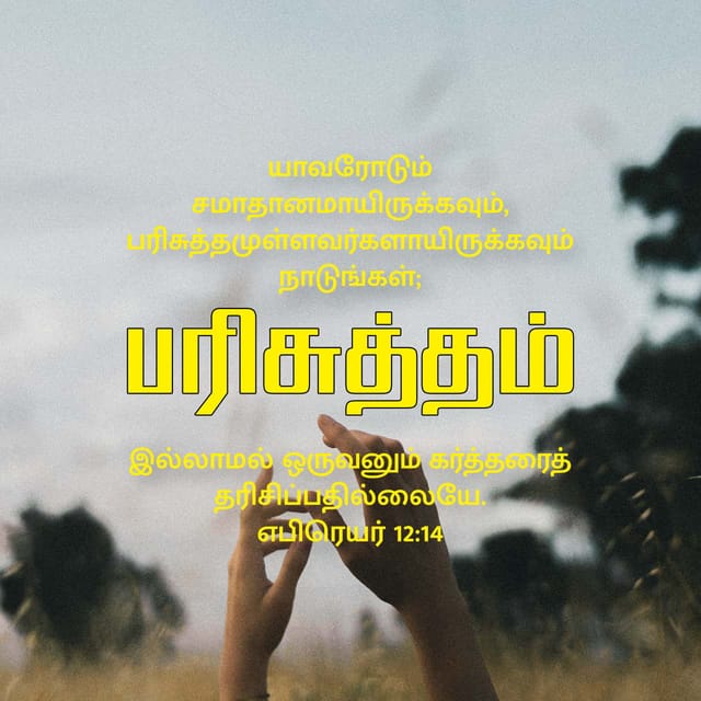 யாவரோடும் சமாதானமாயிருக்கவும், பரிசுத்தமுள்ளவர்களாயிருக்கவும் நாடுங்கள். பரிசுத்தமில்லாமல் ஒருவனும் கர்த்தரைத் தரிசிப்பதில்லையே.