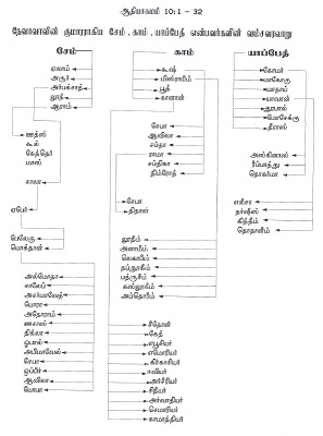 1 நோவாவின் குமாரராகிய சேம் காம் யாப்பேத் என்பவர்களின் வம்ச வரலாறு: ஜலப்பிரளயத்துக்குப்பின்பு அவர்களுக்குக் குமாரர் பிறந்தார்கள்.