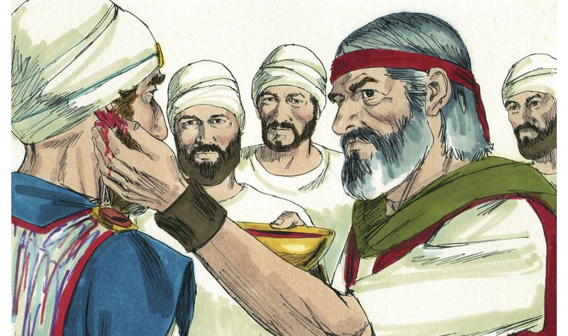 20 அப்பொழுது அந்தக் கடாவை அடித்து, அதின் இரத்தத்தில் கொஞ்சம் எடுத்து, ஆரோனின் வலதுகாது மடலிலும், அவன் குமாரரின் வலதுகாது மடலிலும், அவர்கள் வலதுகையின் பெருவிரலிலும், அவர்கள் வலதுகாலின் பெருவிரலிலும் இட்டு, மற்ற இரத்தத்தைப் பலிபீடத்தின்மேல் சுற்றிலும் தெளித்து,
