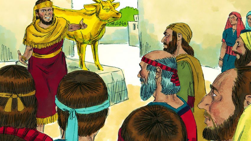 28 ஆகையால் ராஜாவானவன் யோசனைபண்ணி, பொன்னினால் இரண்டு கன்றுக்குட்டிகளை உண்டாக்கி, ஜனங்களைப் பார்த்து: நீங்கள் எருசலேமுக்குப் போகிறது உங்களுக்கு வருத்தம்; இஸ்ரவேலரே, இதோ, இவைகள் உங்களை எகிப்துதேசத்திலிருந்து வரப்பண்ணின உங்கள் தேவர்கள் என்று சொல்லி,
