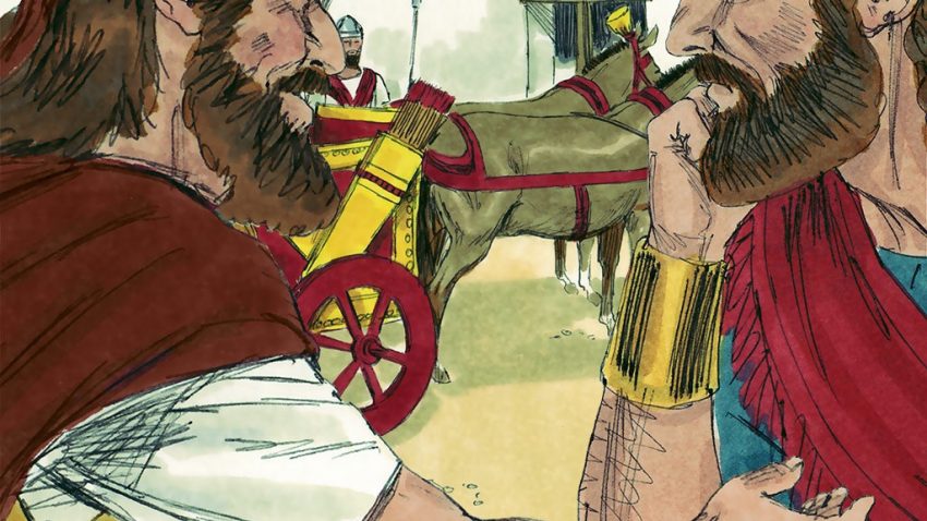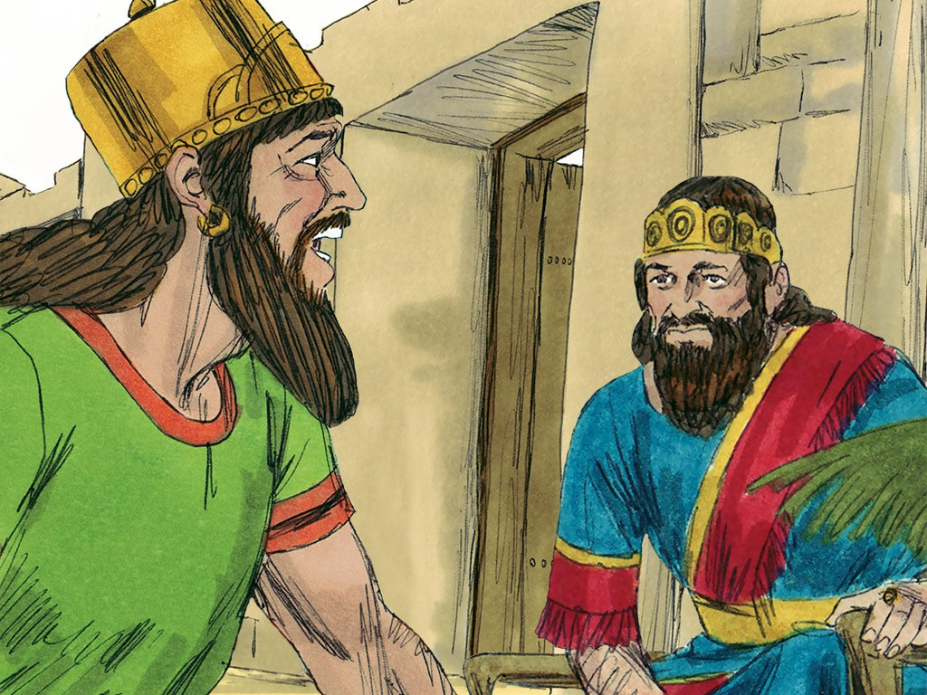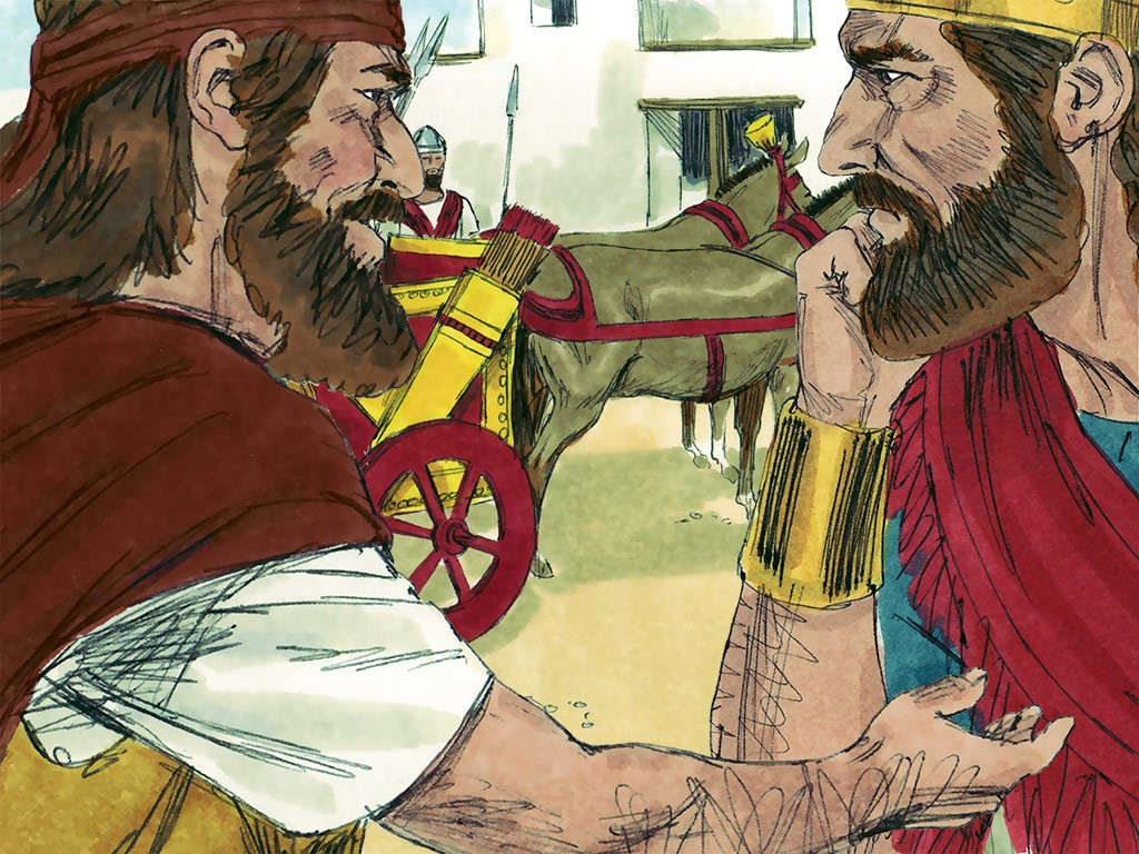 33 அந்த மனுஷர் நன்றாய்க் கவனித்து, அவன் வாயின் சொல்லை உடனே பிடித்து: உமது சகோதரனாகிய பெனாதாத் இருக்கிறான் என்றார்கள்; அப்பொழுது அவன்: நீங்கள் போய், அவனை அழைத்துக் கொண்டுவாருங்கள் என்றான்; பெனாதாத் அவனிடத்தில் வந்தபோது, அவனைத் தன் இரதத்தில் ஏற்றிக்கொண்டான்.