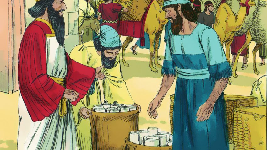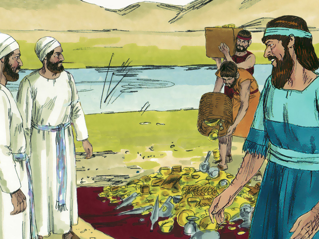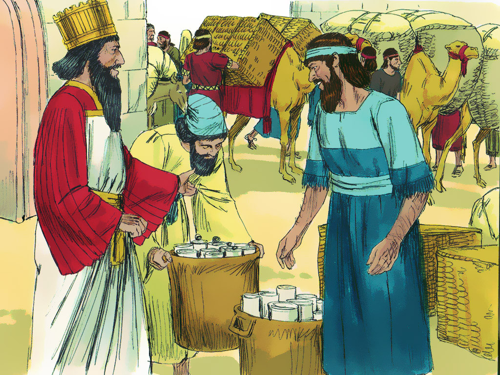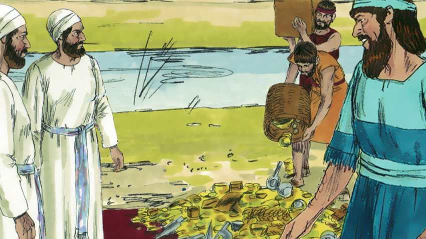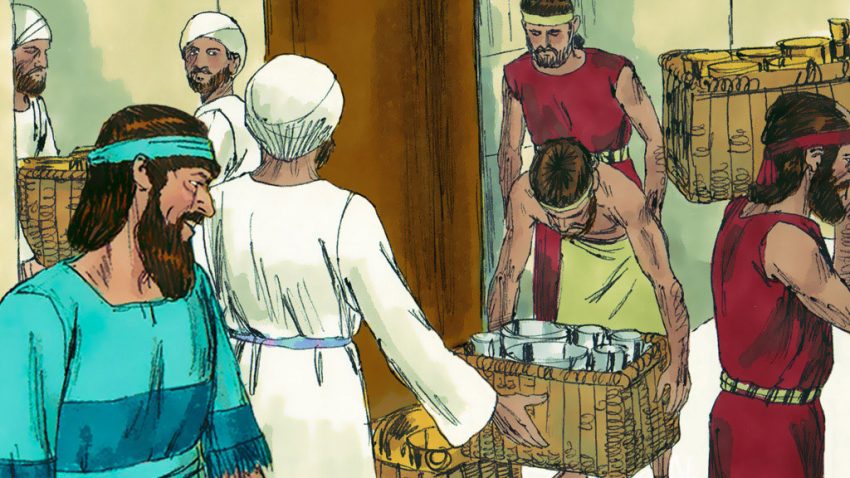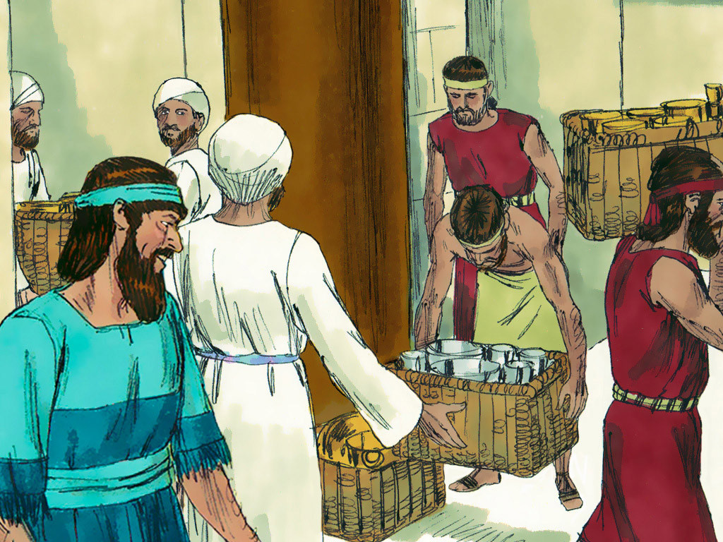 27 ஆயிரம் தங்கக்காசு பெறுமான இருபது பொற்கிண்ணங்களையும், பொன்னைப்போல எண்ணப்பட்ட பளபளப்பான இரண்டு நல்ல வெண்கலப்பாத்திரங்களையும் நிறுத்துக்கொடுத்து,