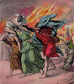 கர்த்தர் சோதோமுக்கு ஏற்படும் அழிவைக் குறித்து ஆபிரகாமோடே பேசினார். ஆபிரகாம் சோதோமுக்காகப் பரிந்து பேசினான். அவரோடு இருந்த 2 தூதர்கள் சோதோமுக்குப் போனார்கள். அந்தத் தூதர்கள் லோத்தையும் அவன் மனைவியையும், இரு குமாரத்திகளையும் பட்டணத்துக்கு வெளியே அழைத்துக்கொண்டுபோய் விட்ட பின்பு, சோதோம் கொமோரா பட்டணத்தை அழித்தார்கள். லோத்தின் மனைவி திரும்பிப் பார்த்து உப்புத்தூண் ஆனாள். (ஆதி.18:22-33, 19:1-29).